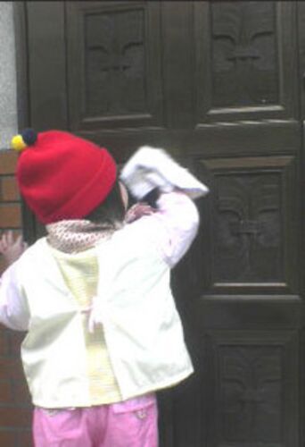 最近、ようやくチーチャン(クマのぬいぐるみ)と人間の顔と表現に違いが出てきて、聞かなくても分るようになってきた。口の周りが丸いのがチーチャン。右端のカーチャンは、ほっぺたを引っ張っているところらしく、自分のほっぺを引っ張って真似ている。
